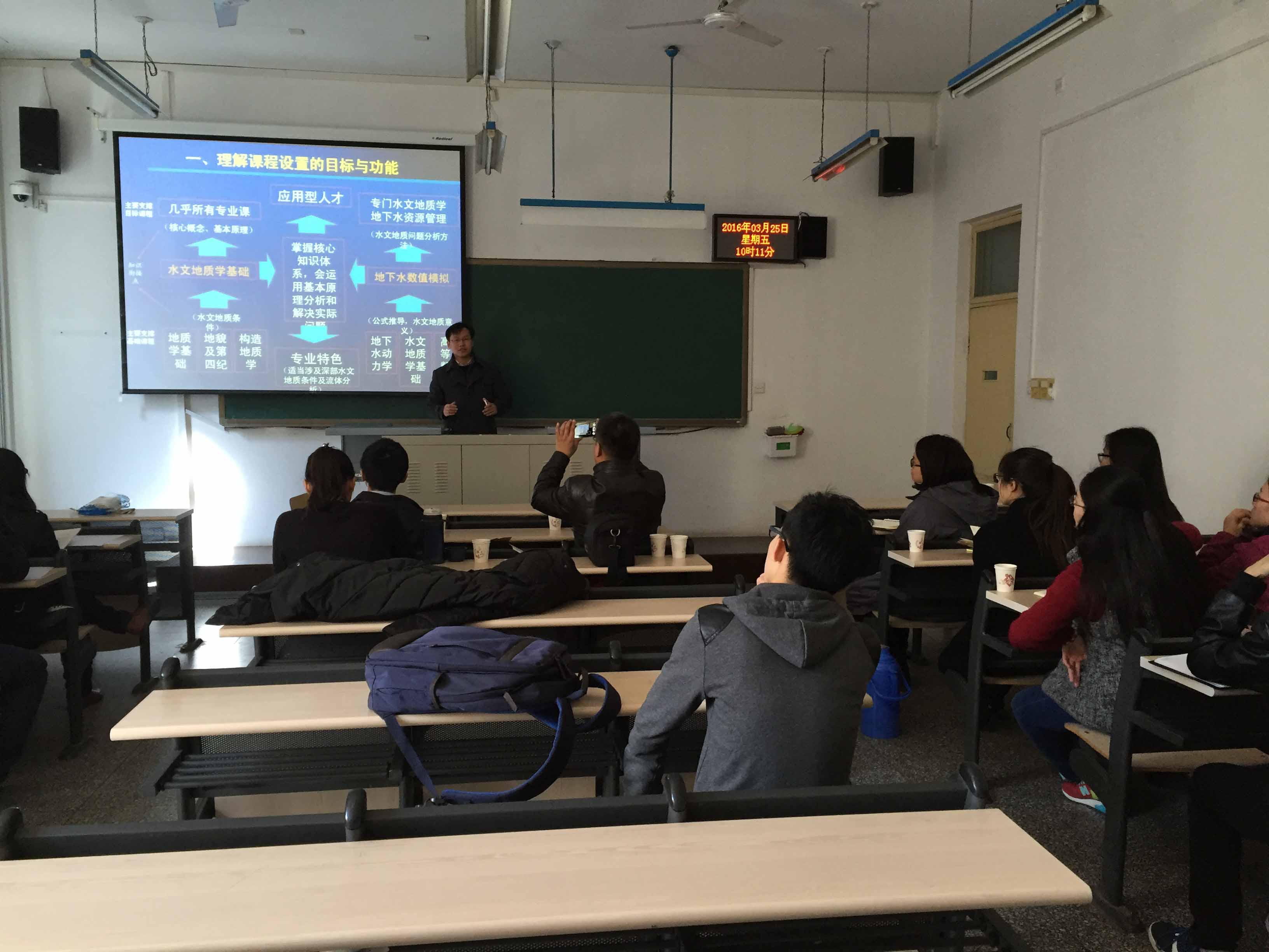 25日上午,杜新强教授就如何提升教学质量进行交流,提出首先要理解课程设置的目标与功能,其次要明确课程教学质量的检验标准,再次,从教师对所讲内容的理解程度和课堂教学方式与方法这两个层面阐述了课程教学质量保障的方法,最后以《水文地质学基础》与《地下水数值模拟》课程为例进行示范课堂,以生动具体的例子,对提出的提升教学质量的方法进行了现场实践。