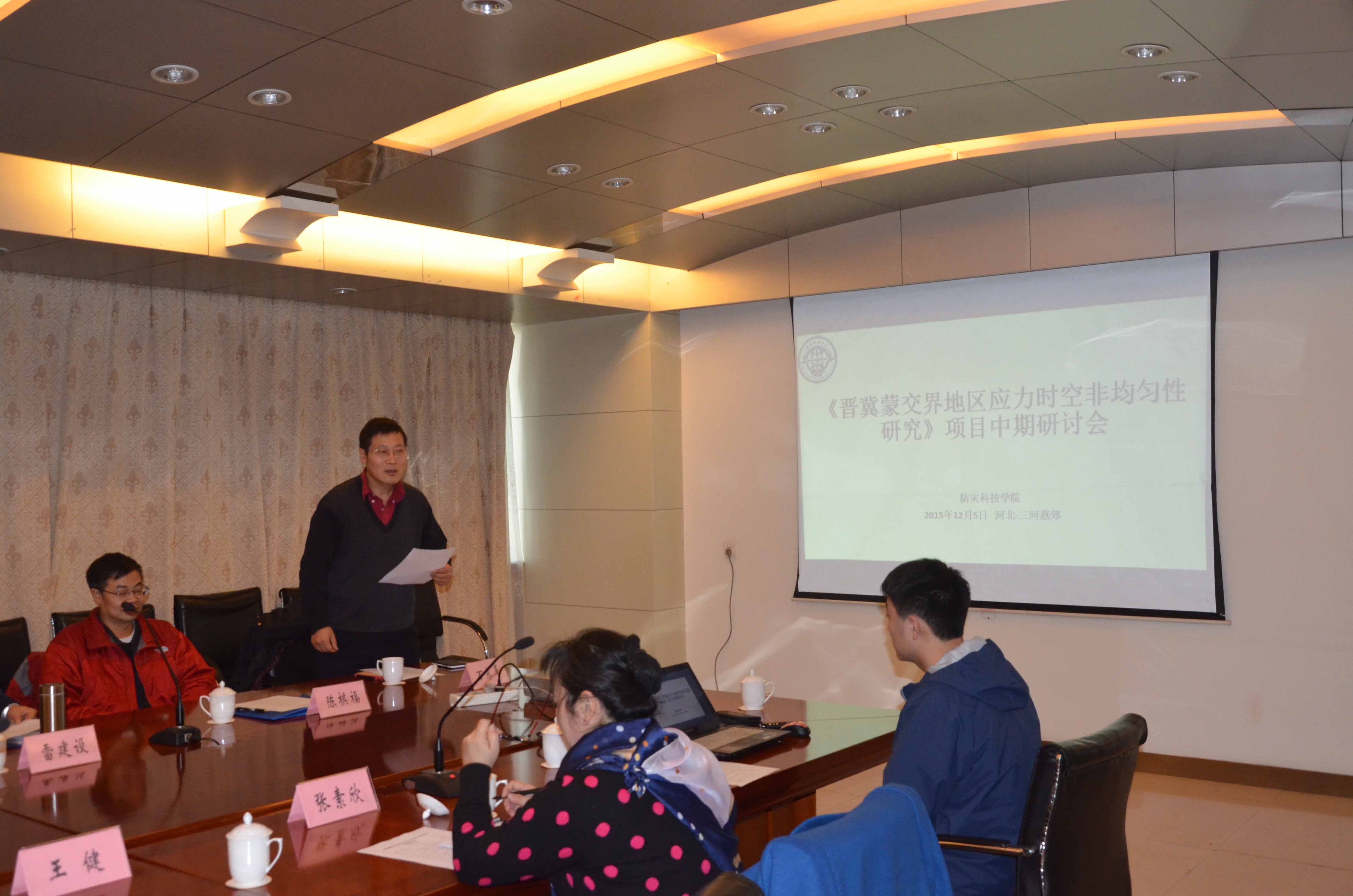 2015年12月5日,地震科学系万永革研究员的研究小组举办了《晋冀蒙交界地区应力时空非均匀性研究》项目的中期研讨会。出席本次会议的外单位专家有:中国科学院地质与地球物理研究所陈琪福研究员,中国地震局地壳应力研究所雷建设研究员、张永庆副研究员,河北省地震局张素欣研究员、王立军高级工程师、王晓山副研究员,青海省地震局屠泓为副研究员、内蒙古自治区地震局韩晓明高级工程师、河北省地震局邯郸中心台副台长闫俊岗高级工程师等研究人员;学院科研处副处长蔡晓光副教授,学院基础部王福昌教授等人员应邀参加了本次会议。