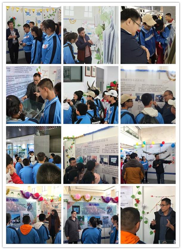 走进正在天仪楼举办的地球科学学院地质实习成果展展厅,中学生们认真聆听专业老师们深入浅出的生动讲解,并饶有兴致的观看现场展出的各种岩石标本和实习装备;来到灾害模拟实验室,土木工程学院宣越老师带领大家参观地震监测仪器和房屋缩比模型,现场科普防震减灾知识,引起了大家对灾害预防的极大兴趣;在岩石标本实验室、地震台网中心、古生物标本实验室、水槽实验室,中学生们被各种矿物、化石和实验仪器深深吸引,地球科学学院的老师们分组在现场进行介绍,耐心的解答了大家提出的各种问题。