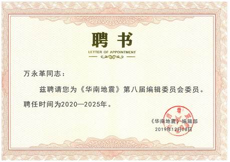 日前,pp电子万永革研究员受聘为《华南地震》第八届编辑委员会委员,聘任时间为2020—2025年。