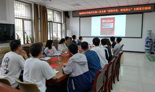 青春同行,致敬百年。为认真学习贯彻习近平总书记“七一”重要讲话精神,坚定理想信念、践行初心使命,9月30日下午,地球科学学院学生第二党支部在长庚楼126会议室组织召开“强国有我,请党放心”主题党日活动。
