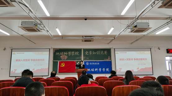 为加强青年入党积极分子的培养,团结带领广大同学听党话、跟党走,坚定理想信念,地球科学学院学生党建工作中心举办了“不忘初心,牢记使命”党章知识竞赛。经过初赛选拔,10月21日中午,知识竞赛决赛在天仪楼508举行。地球科学学院党总支书记唐圣华老师、学生第一党支部书记黄骥超老师、学生第二党支部书记王鹤老师出席并担任决赛评委。