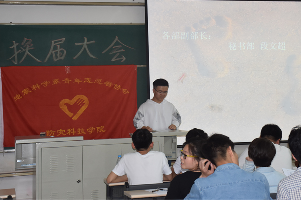 2018年5月26日晚,地震科学系青年志愿者协会在北校长庚楼306教室举行了一年一度的换届竞聘大会,青协全体成员参加了换届大会。换届竞聘大会在一段暖心回忆视频后开始了,副会张浩楠和各部门负责人先后代表青协和部门对过去一年的工作进行了总结汇报。报名参加换届竞聘的同学依次上台进行了演说,充分展示了自身的优势和对工作的设想。经过近两个小时,整个活动圆满结束。(撰稿:唐圣华 摄影:张浩楠)