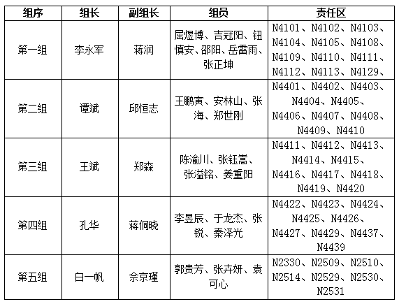 4.宿舍巡查,各组按照分区每天不定时进行宿舍巡查,密切掌握责任区内各宿舍同学在校状况,发现异常情况要及时向辅导员老师或学院领导报告。
