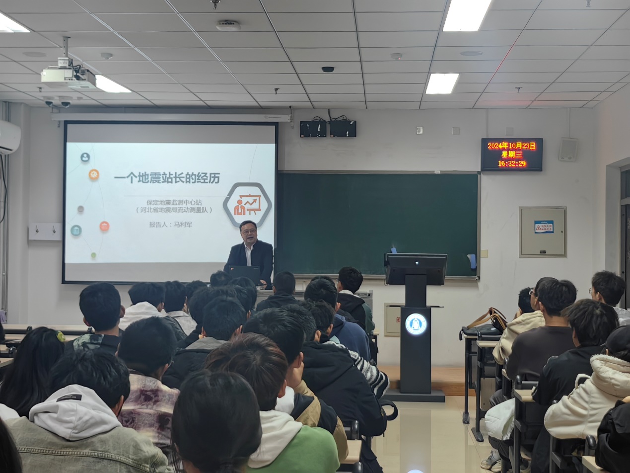 10月23日下午,河北省保定地震监测中心站站长、高级工程师马利军应邀来学校作了题为“一个地震站长的经历”的主题讲座。讲座由地球科学学院副院长孙珍军教授主持。