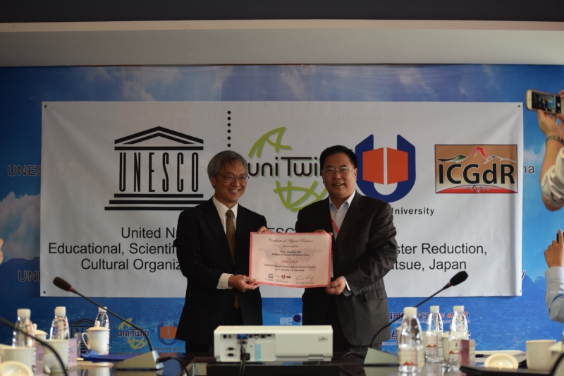 汪发武讲席教授向防灾科技学院颁发UNESCO国际协作单位证书