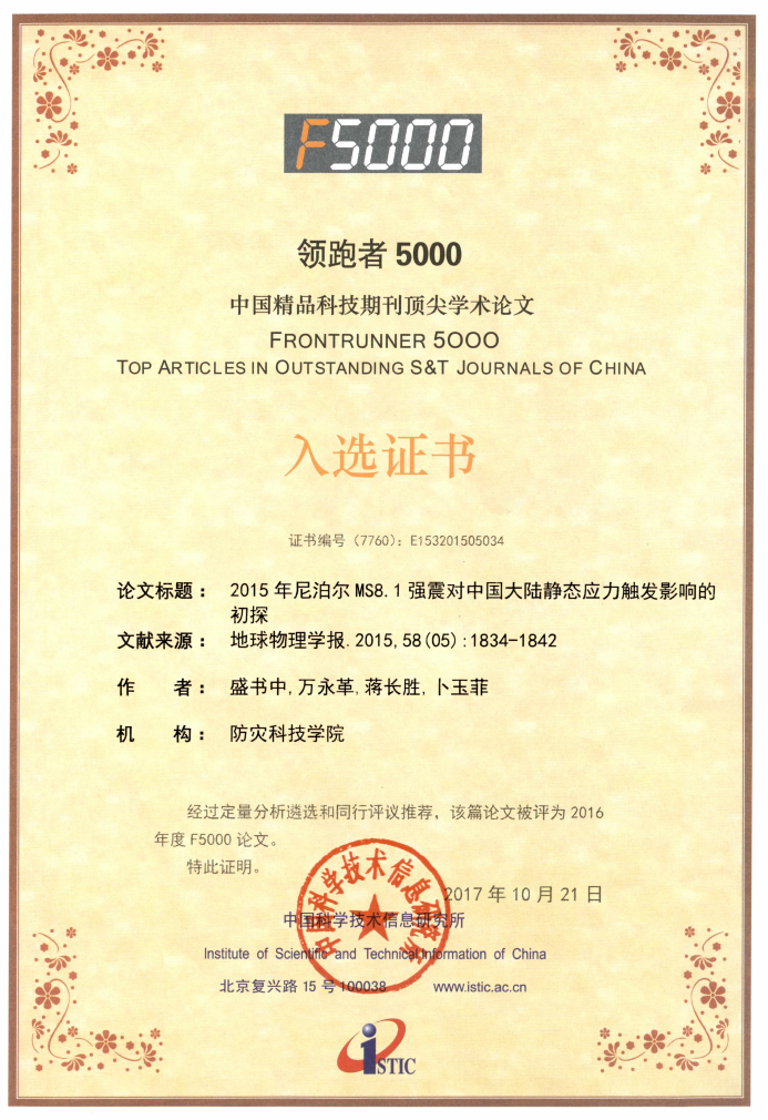 2017年中国科学技术信息研究所公布的2016年度“领跑者5000——中国精品科技期刊顶尖学术论文(F5000)”,我系盛书中副教授为第一作者撰写发表的“2015年尼泊尔MS8.1强震对中国大陆静态应力触发影响的初探”论文入选,该论文发表在《地球物理学报》(2015年第58期)上,论文的资助项目为中国地震局教师基金项目(20140102) 、中央高校基本科研业务专项资金(创新项目团队资助计划) (ZY20110101) 和国家国际科技合作专项项目(2012DFG20510)。该论文为pp电子第一篇入选F5000(即领跑者5000)的学术论文,入选F5000的论文需经过定量分析遴选和同行评议推荐。该文能够入选,说明其内容科学、严谨,反映该研究具有一定的创新性和较高的学术水平。